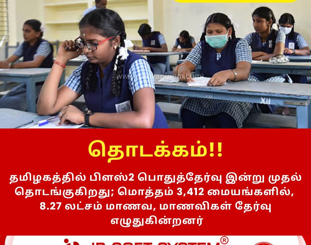 தமிழகத்தில் பிளஸ்2 பொதுத்தேர்வு இன்று முதல் தொடங்குகிறது மொத்தம் 3,412 மையங்களில், 8.27 லட்சம் மாணவ, மாணவிகள் தேர்வு எழுதுகின்றனர்.