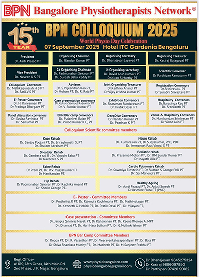 The 15th Annual BPN Colloquium 2025 was held on 7th September 2025 at Hotel ITC Gardenia, Bengaluru, celebrating World Physio Day in grand style. Organized by the Bangalore Physiotherapists Network (BPN), the event brought together over 500 physiotherapists, renowned experts, and medical enthusiasts from across the country.