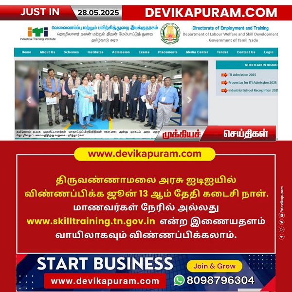 திருவண்ணாமலை அரசு ஐடிஐயில் விண்ணப்பிக்க ஜூன் 13 ஆம் தேதி கடைசி நாள். மாணவர்கள் நேரில் அல்லது www.skilltraining.tn.gov.in என்ற…