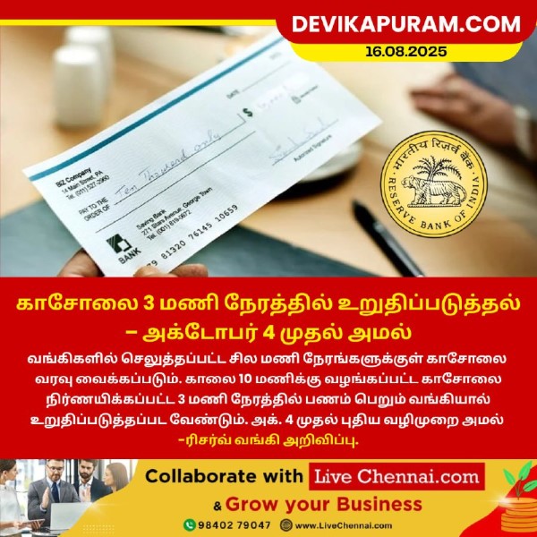 வங்கிகளில் செலுத்தப்பட்ட சில மணி நேரங்களுக்குள் காசோலை வரவு வைக்கப்படும். காலை 10 மணிக்கு வழங்கப்பட்ட காசோலை நிர்ணயிக்கப்பட்ட 3 மணி நேரத்தில் பணம் பெறும் வங்கியால் உறுதிப்படுத்தப்பட வேண்டும். அக்.…