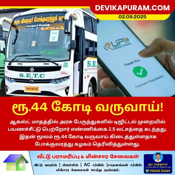 ஆகஸ்ட் மாதத்தில் அரசு பேருந்துகளில் டிஜிட்டல் முறையில் பயணச்சீட்டு பெற்றோர் எண்ணிக்கை 2.5 லட்சத்தை கடந்தது. இதன் மூலம் ரூ.44 கோடி வருவாய் கிடைத்துள்ளதாக போக்குவரத்து…