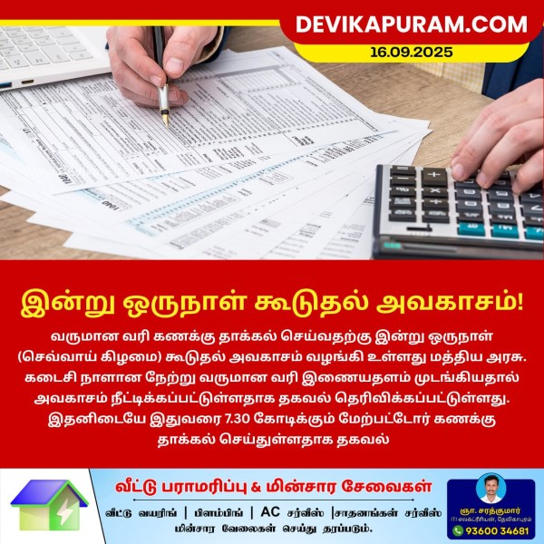 வருமான வரி கணக்கு தாக்கல் செய்வதற்கு இன்று ஒருநாள் (செவ்வாய் கிழமை) கூடுதல் அவகாசம் வழங்கி உள்ளது மத்திய அரசு. கடைசி நாளான நேற்று…