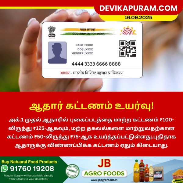 அக்டோபர்-01 முதல் ஆதாரில் புகைப்படத்தை மாற்ற கட்டணம் ரூ.100- லிருந்து ரூ.125-ஆகவும், மற்ற தகவல்களை மாற்றுவதற்கான கட்டணம் ரூ.50-லிருந்து ரூ.75-ஆக…