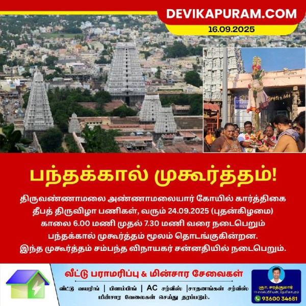 திருவண்ணாமலை அண்ணாமலையார் கோயில் கார்த்திகை தீபத் திருவிழா பணிகள், வரும் 24.09.2025 (புதன்கிழமை) காலை 6.00 மணி முதல் 7.30…