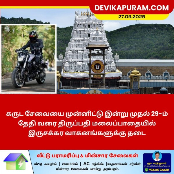 கருட சேவையை முன்னிட்டு இன்று முதல் 29-ம் தேதி வரை திருப்பதி மலைப்பாதையில் இருசக்கர வாகனங்களுக்கு தடை.