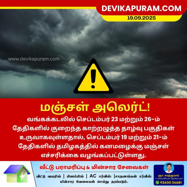 வங்கக்கடலில் செப்டம்பர் 23 மற்றும் 26-ம் தேதிகளில் குறைந்த காற்றழுத்த தாழ்வு பகுதிகள் உருவாகவுள்ளதால், செப்டம்பர் 19 மற்றும் 21-ம்…