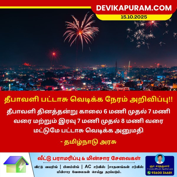 தீபாவளி தினத்தன்று காலை 6 மணி முதல் 7 மணி வரை மற்றும் இரவு 7 மணி முதல் 8…