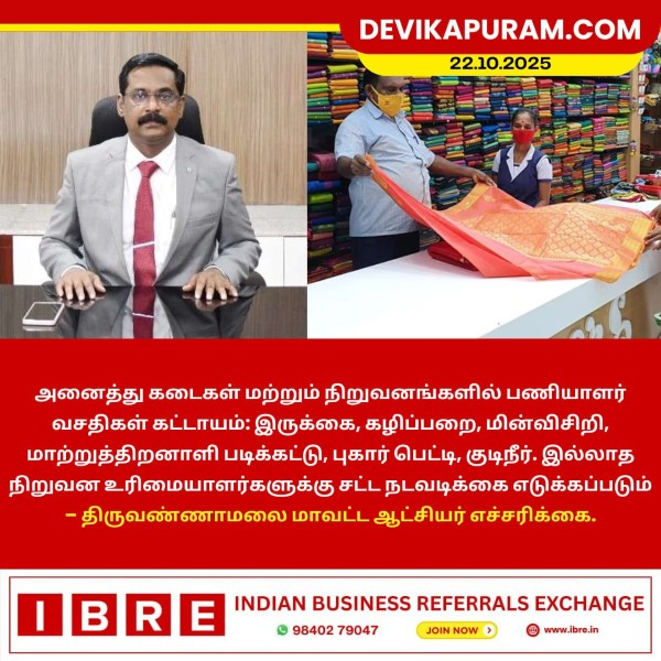 அனைத்து கடைகள் மற்றும் நிறுவனங்களில் பணியாளர் வசதிகள் கட்டாயம்: இருக்கை, கழிப்பறை, மின்விசிறி, மாற்றுத்திறனாளி படிக்கட்டு, புகார் பெட்டி, குடிநீர்.…