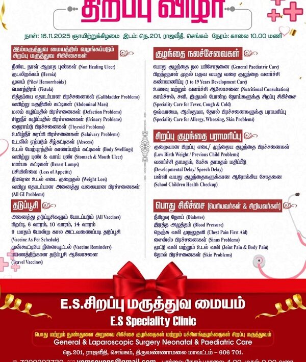செங்கம் ராஜவீதியில் புதிய E.S. Speciality Clinic – நவம்பர் 16ல் திறப்பு செங்கம் ராஜவீதியில் புதிதாக அமைக்கப்பட்ட E.S.…