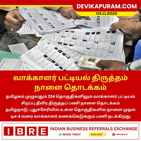 தமிழகம் முழுவதும் 234 தொகுதிகளிலும் வாக்காளர் பட்டியல் சிறப்பு தீவிர திருத்தப் பணி நாளை தொடக்கம் தமிழ்நாடு, புதுச்சேரியில் உள்ள…