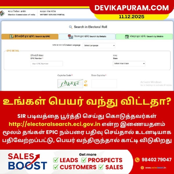 SIR படிவத்தை பூர்த்தி செய்து சமர்ப்பித்த வாக்காளர்கள், தங்களுடைய பெயர் வாக்காளர் பட்டியலில் சேர்க்கப்பட்டுள்ளதா என்பதை உடனடியாக சரிபார்க்கலாம். http://electoralsearch.eci.gov.in…