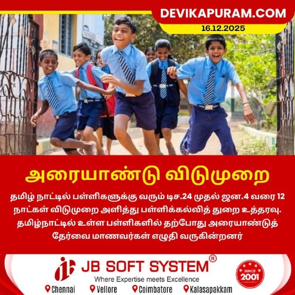 தமிழ் நாட்டில் பள்ளிகளுக்கு வரும் டிச.24 முதல் ஜன.4 வரை 12 நாட்கள் விடுமுறை அளித்து பள்ளிக்கல்வித் துறை உத்தரவு.…