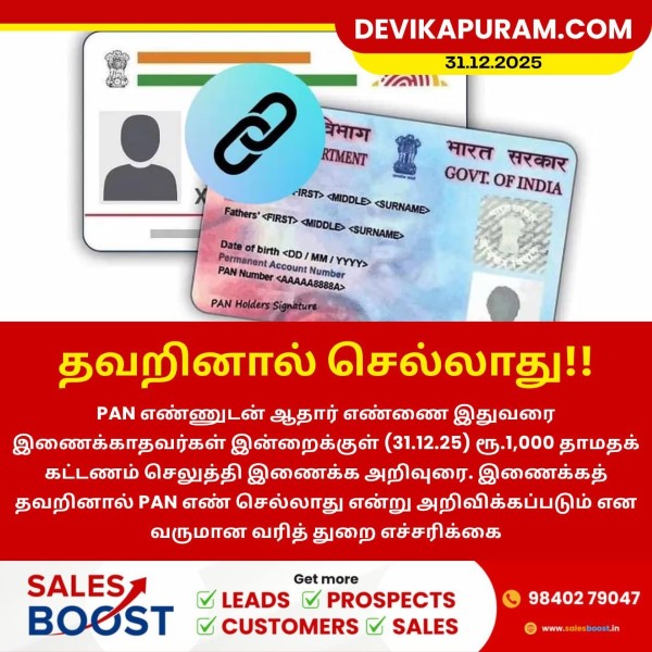 PAN எண்ணுடன் ஆதார் எண்ணை இதுவரை இணைக்காதவர்கள் இன்றைக்குள் (31.12.25) ரூ.1,000 தாமதக் கட்டணம் செலுத்தி இணைக்க அறிவுரை. இணைக்கத்…