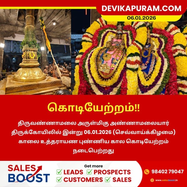 திருவண்ணாமலை அருள்மிகு அண்ணாமலையார் திருக்கோயிலில், இன்று 06.01.2026 (செவ்வாய்க்கிழமை) காலை, உத்தராயண புண்ணிய காலத்தை முன்னிட்டு கொடியேற்றம் சிறப்பாக நடைபெற்றது.