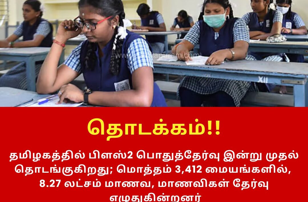 தமிழகத்தில் பிளஸ்2 பொதுத்தேர்வு இன்று முதல் தொடங்குகிறது மொத்தம் 3,412 மையங்களில், 8.27 லட்சம் மாணவ, மாணவிகள் தேர்வு எழுதுகின்றனர்.