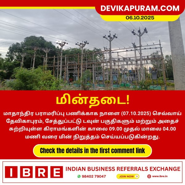 மாதாந்திர பராமரிப்பு பணிக்காக நாளை (02.12.2025) செவ்வாய்கிழமை காலை 9.00 மணி முதல் 4.00 மணி வரை மின் நிறுத்தம் செய்யப்படுகிறது. மின் வினியோகம் நிறுத்துப்படும்…