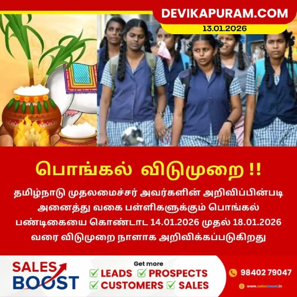 தமிழ்நாடு முதலமைச்சர் அவர்களின் அறிவிப்பின்படி, அனைத்து வகை பள்ளிகளுக்கும் பொங்கல் பண்டிகையை முன்னிட்டு 14.01.2026 முதல் 18.01.2026 வரை விடுமுறை…