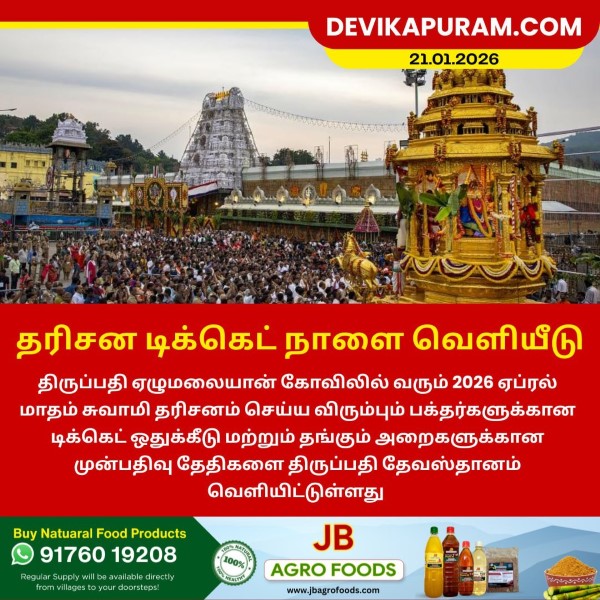 திருப்பதி ஏழுமலையான் கோவிலில் வரும் 2026 ஏப்ரல் மாதம் சுவாமி தரிசனம் செய்ய விரும்பும் பக்தர்களுக்கான டிக்கெட் ஒதுக்கீடு மற்றும் தங்கும் அறைகளுக்கான முன்பதிவு தேதிகளை திருப்பதி தேவஸ்தானம் வெளியிட்டுள்ளது.