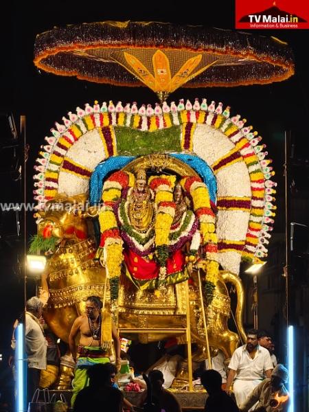 நினைத்தாலே முக்தி தரும் திருவண்ணாமலை கார்த்திகை தீபத்திருவிழா அருள்மிகு அருணாசலேசுவரர் திருக்கோயில் பத்தாம் நாள் இரவு நேற்று (05.12.2025) பஞ்சமூர்த்திகள்- தங்க ரிஷப வாகனத்தில் காட்சியளித்தார்.