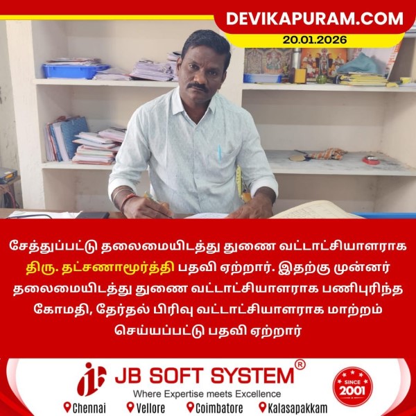 சேத்துப்பட்டு தலைமையிடத்து துணை வட்டாட்சியாளராக திரு. தட்சணாமூர்த்தி பதவி ஏற்றார். இதற்கு முன்னர் தலைமையிடத்து துணை வட்டாட்சியாளராக பணிபுரிந்த கோமதி, தேர்தல் பிரிவு வட்டாட்சியாளராக மாற்றம் செய்யப்பட்டு பதவி ஏற்றார்.