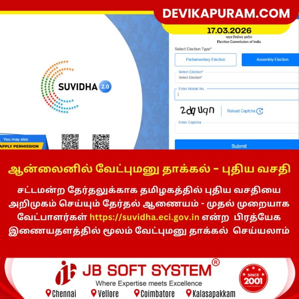 சட்டமன்ற தேர்தலுக்காக தமிழகத்தில் புதிய வசதியை அறிமுகம் செய்யும் தேர்தல் ஆணையம் – முதல் முறையாக வேட்பாளர்கள் https://suvidha.eci.gov.in என்ற இணையதளத்தில் மூலம் வேட்புமனு தாக்கல் செய்யலாம்.