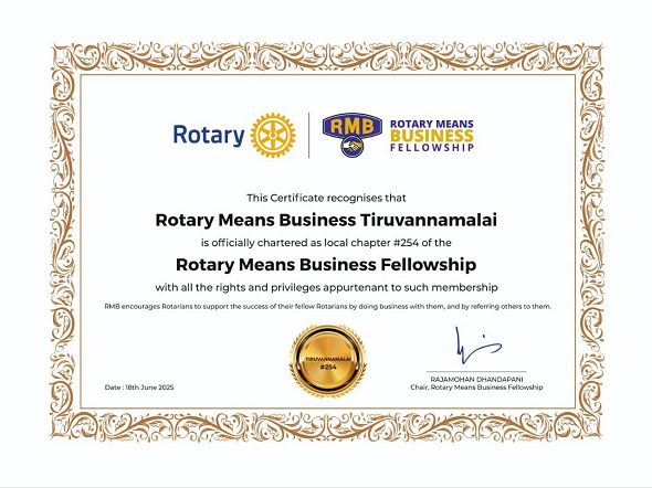A proud moment for Rotary District 3231 as the Rotary Means Business Fellowship (RMBF) Thiruvannamalai Chapter was officially granted its charter on June 18, during the RI-designated Rotary Fellowship Month.
