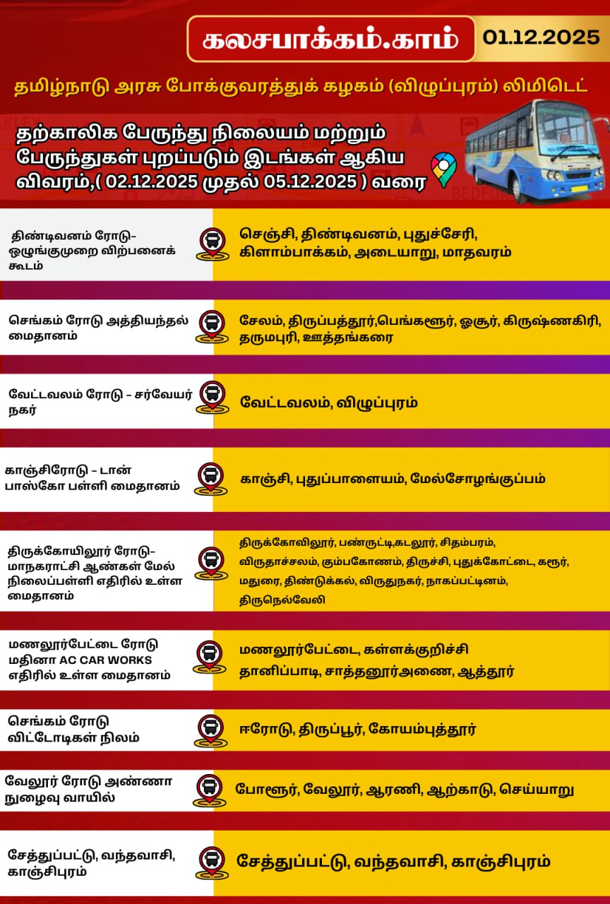 திருவண்ணாமலை அண்ணாமலையார் திருக்கோவிலில் நடைபெறும் திருக்கார்த்திகை தீபத் திருவிழாவும் பௌர்ணமி கிரிவலமும் முன்னிட்டு, 02.12.2025 முதல் 05.12.2025 வரை பக்தர்களின் வசதிக்காக அனைத்து போக்குவரத்து கழகங்கள் சார்பில் தற்காலிக பேருந்து நிலையங்களிலிருந்து சிறப்பு பேருந்துகள் இயக்கப்படும் விவரம்.
