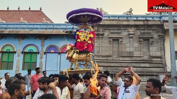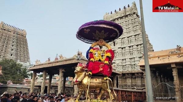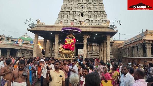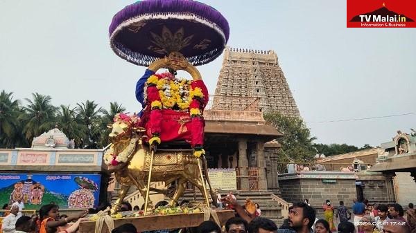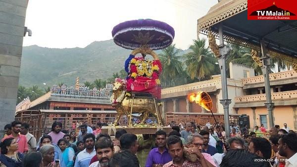 திருவண்ணாமலை அருணாச்சலேஸ்வரர் திருக்கோவிலில் புதன்கிழமை (21.02.2024) மாசி மாத பௌர்ணமி பிரதோஷத்தை முன்னிட்டு நந்தி பகவானுக்கு சிறப்பு அபிஷேக ஆராதனை மற்றும் தங்க ரிஷப வாகனத்தில் பிரதோஷ நாயகர் பவனி நடைபெற்றது. இதில் திரளான பக்தர்கள் கலந்து கொண்டு சாமி தரிசனம் செய்தார்கள்.