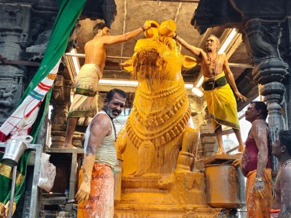 திருவண்ணாமலையில் அருணாச்சலேஸ்வரர் திருக்கோவிலில் நேற்று (17-12-2025)  மார்கழி மாத அமாவாசை பிரதோஷத்தை முன்னிட்டு நந்தி பகவானுக்கு சிறப்பு அபிஷேக ஆராதனை நடைபெற்றது. இதில் திரளான பக்தர்கள் கலந்து கொண்டு அரோகரா கோஷத்துடன் தரிசனம் செய்தார்கள்.