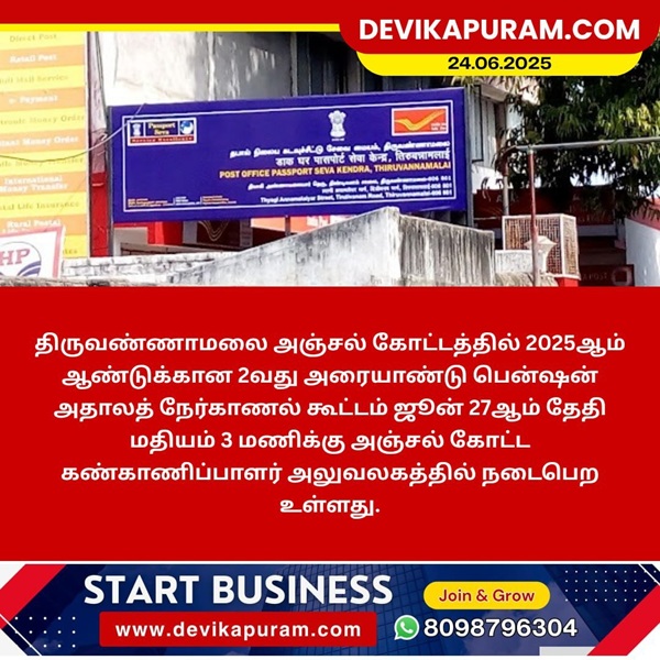 திருவண்ணாமலை அஞ்சல் கோட்டத்தில் 2025ஆம் ஆண்டுக்கான 2வது அரையாண்டு பென்ஷன் அதாலத் நேர்காணல் கூட்டம் ஜூன் 27ஆம் தேதி மதியம் 3 மணிக்கு அஞ்சல் கோட்ட கண்காணிப்பாளர் அலுவலகத்தில் நடைபெற உள்ளது.